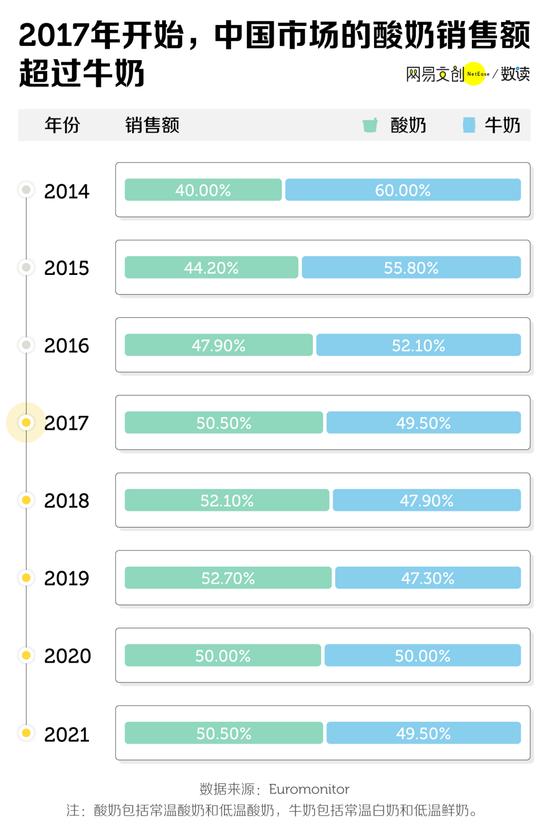 在 2010 年,酸奶的全国销售额仅有 330 亿元,不足牛奶的一半 [4];2017 年,酸奶销售额开始超过牛奶。