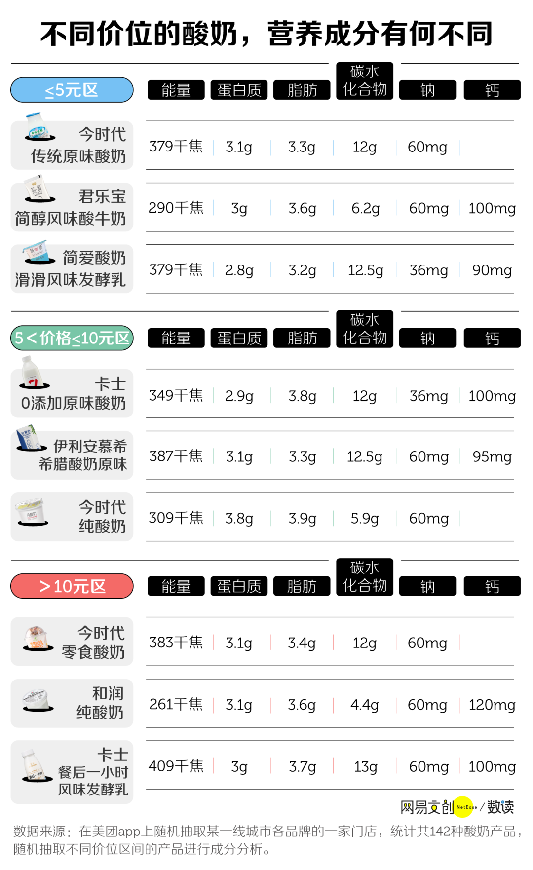 剥开宣传标签的迷雾,我们再对便利店中不同价格区间的酸奶的营养成分表和配料表做了抽样对比,看看最终落到真材实料层面,高端酸奶们到底矜贵多少。