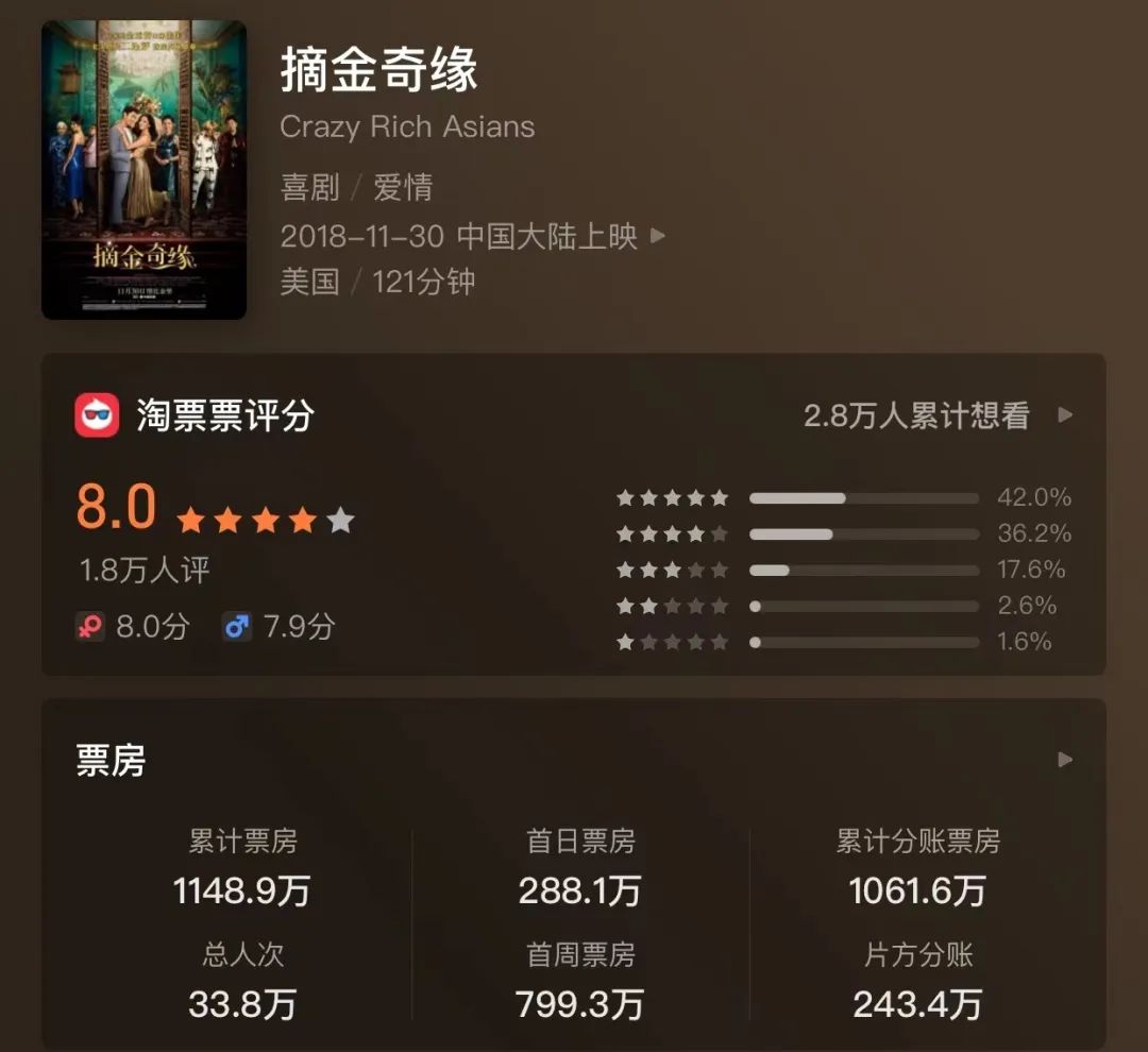 电影上映首周,亚裔观众比例高达38%(此前不足10%),打破北美的亚裔观影纪录。