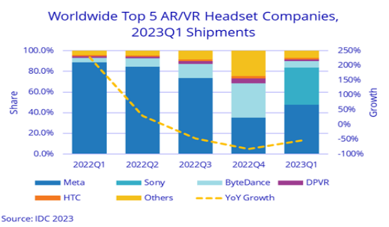 根据IDC的数据,尽管经济低迷,但Meta的出货量占比在2023年一季度依然达到47%。
