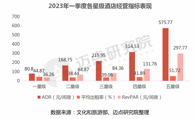 2023年一季度各星级酒店经营情况比较而言,整体来看,星级酒店平均房价、平均出租率和每间可供出租客房收入RevPAR三大经营指标表现与星级等级呈正相关,即从一星级至五星级,各指标呈递增态势(除二星级酒店平均出租率38.44%低于一星级44.87%外)。