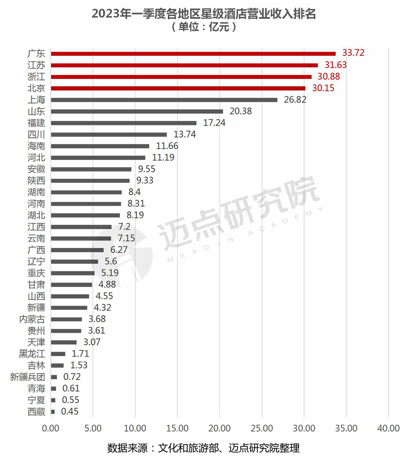 2.酒店营业收入:广东省以33.72亿元位列各地区第一,超30亿元的共4个地区