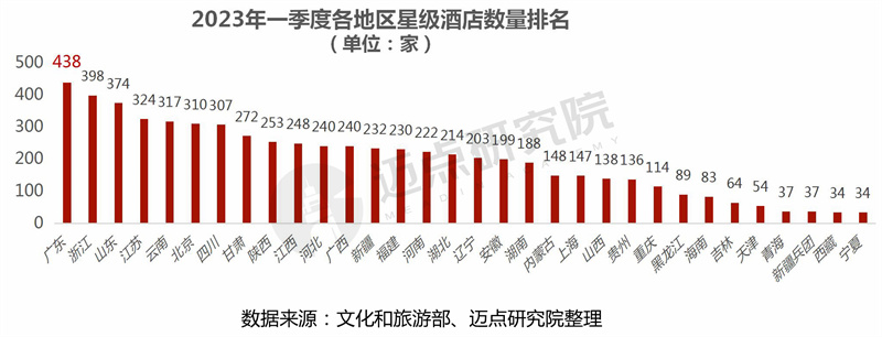 从各地区星级酒店数量来看,广东省星级酒店数量最多,为438家,其次是浙江、山东、江苏、云南、北京、四川,星级酒店数量均在300家以上。而青海、新疆兵团、西藏和宁夏等西部地区星级酒店数量较少,均不到50家。