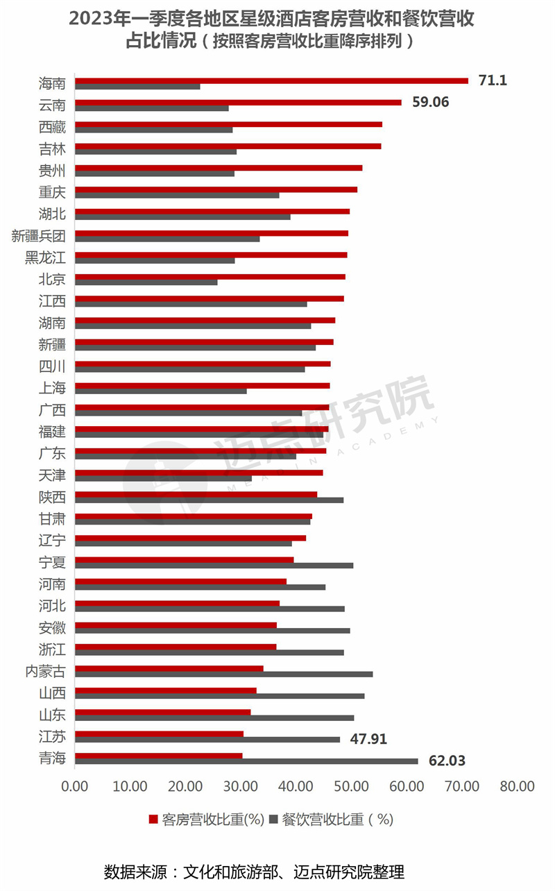 从各地区星级酒店营收结构看,21个地区以客房收入为主,尤其以海南省最为突出,客房营收占比71.1%;11个地区以餐饮营收为主,且青海省餐饮营收占比62.03%,为各地区最高;餐饮营收占比超全国水平(40.78)的地区共计18个;客房营收占比高于全国水平(43.25)的地区共计20个。