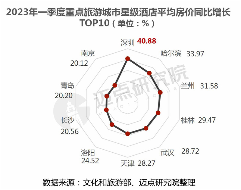 平均房价同比方面,45个城市同比为正增长,同比增长前十名的城市依次为深圳、哈尔滨、兰州、桂林、武汉、天津、洛阳、长沙、青岛和南京,其中深圳市星级酒店平均房价同比增幅最大,为40.88%。