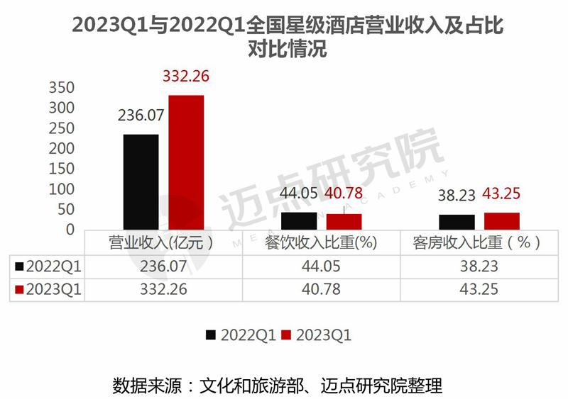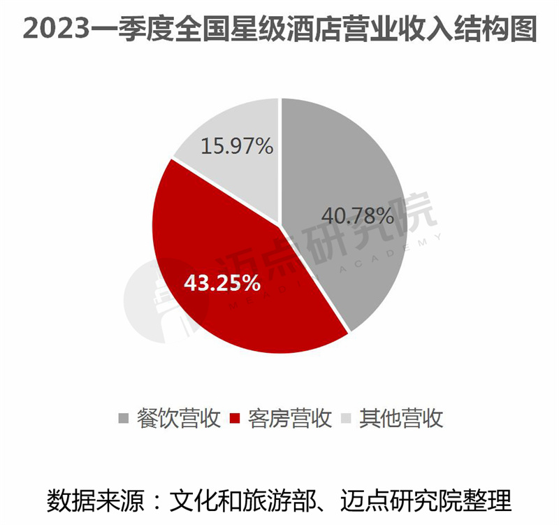 2023年第一季度全国星级酒店营收收入总计332.26亿元,其中餐饮收入占比40.78%,客房收入占比43.25%。同比来看,受政策和经济环境的利好影响,2023年一季度较2022年同期,营业收入大幅增长,具体增加96.19亿元,增幅达40.75%。此外,从餐饮收入和客房收入占比情况看,2023年一季度客房营收比重超餐饮占比,反映了商旅出差需求的回归,酒店客房营收逐步恢复。