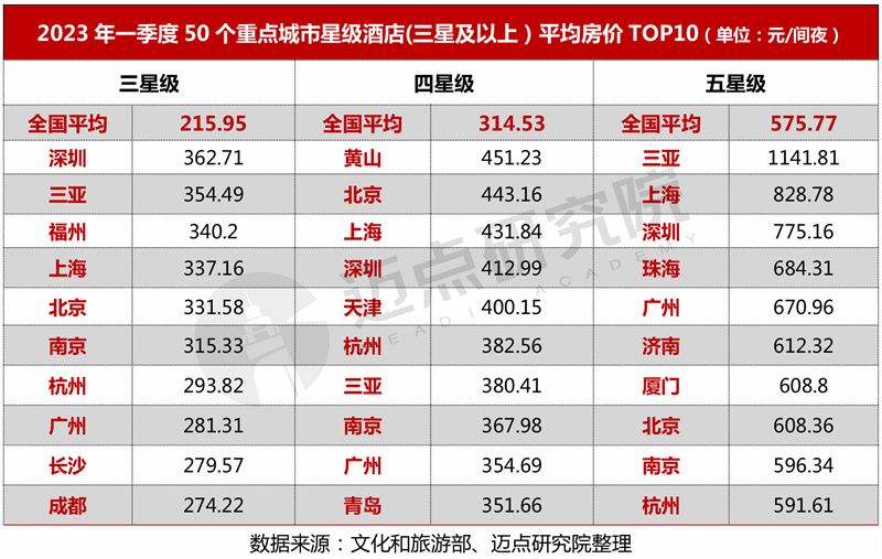 从不同星级看,50个重点旅游城市三星及以上星级酒店平均房价情况,50个城市中三星级酒店平均房价最高的为深圳市362.71元/间夜;四星级酒店平均房价最高的为黄山市,具体为451.23元/间夜,比全国四星级酒店平均房价高出136.7元/间夜;五星级酒店房价最高的为三亚市1141.81元/间夜,反映了三亚高星级酒店的竞争优势,三亚一季度旅游住宿需求大幅提升,高星级酒店“一房难求”,部分酒店春节期间涨价近一倍。