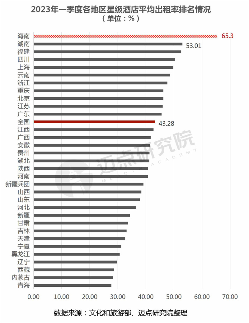 4.酒店平均出租率:海南省为唯一出租率超60%的地区,表现突出