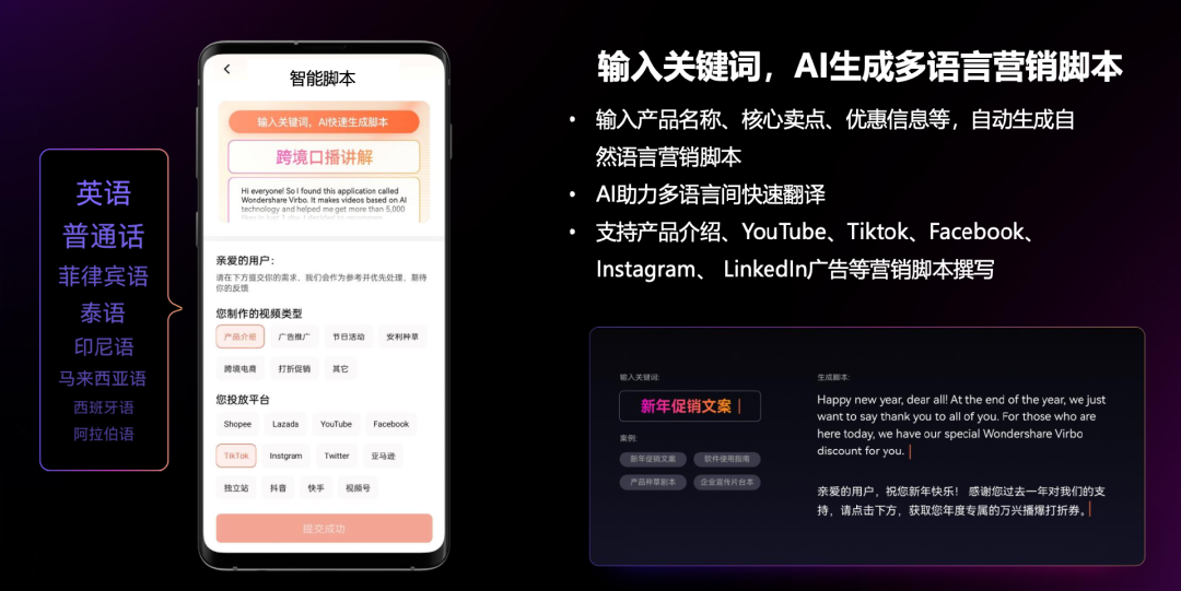 据悉,万兴播爆海外版Wondershare Virbo已推出0门槛AI生成脚本新功能,为用户带来从脚本、“真人”出镜到视频自动生成的“全链路AIGC创作”体验。