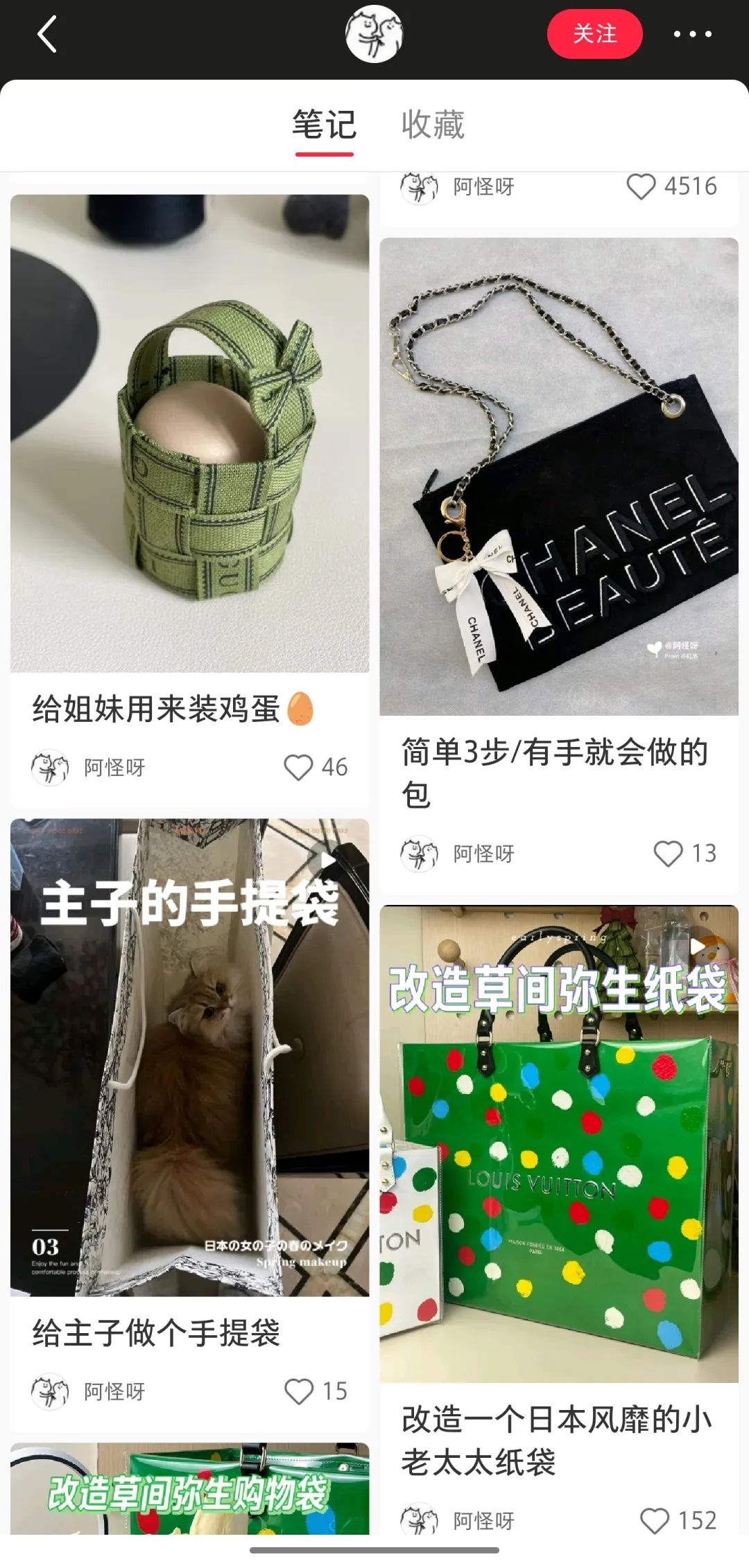 就像收集纸袋衍生出了二级市场的交易一样,纸袋的二次利用也形成了一门生意。小红书上的手工博主「阿怪呀」三年前开始从事纸袋改造生意。某位来自广东的客户寄来LV跟日本艺术家草间弥生的联名纸袋,要求改造成健身包;另一位客户则寄来Dior的精品店纸袋,要求改造成装猫咪的手提袋。