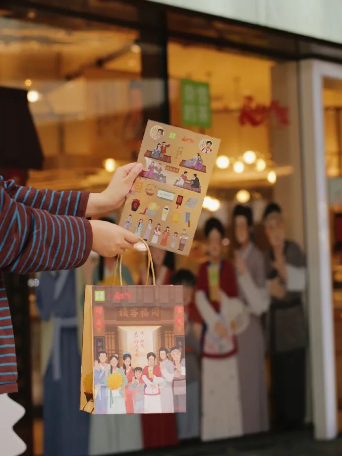 以奈雪跟《武林外传》的联动为例,奈雪认为《武林外传》传递了非常动人的温暖情感关系,是很多人的电子榨菜、避风港。在联名款茶饮「霸气榴莲」的纸袋上,同福客栈的7位「住户」站在一排向观众挥手,设计灵感正来源于《武林外传》80集结尾处的告别镜头,搭配纸袋上印刷的「嘿,朋友,我们好久不见」,恰恰隐喻奈雪经典产品霸气榴莲和《武林外传》IP的双重回归。