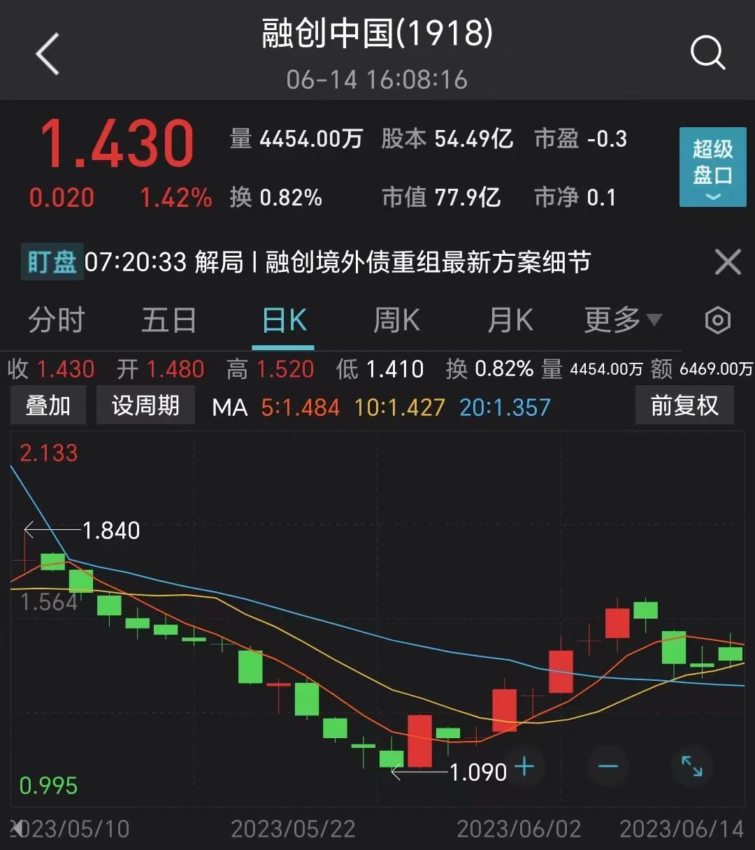 尽管此次将最低转股价由每股4.58港元调低至4港元,但从融创复牌之后,股价就一路走低,目前每股价格仅为1.43港元。