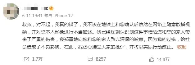 此后,当事女子发微博道歉。是非曲直,已然清楚,那就是女子行为是错误的,但大叔及其家属对此选择谅解后,事件本身按常理来说就应到此为止。