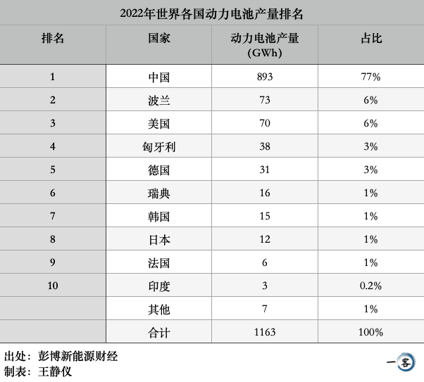 彭博新能源财经数据显示,2022年中国电池产能居全球第一,893GWh,占比达77%;波兰和美国分列第二和第三位,生产了73和70GWh的电池,全球占比均为6%;匈牙利排名第四,38Gwh,全球产能占比为3%。