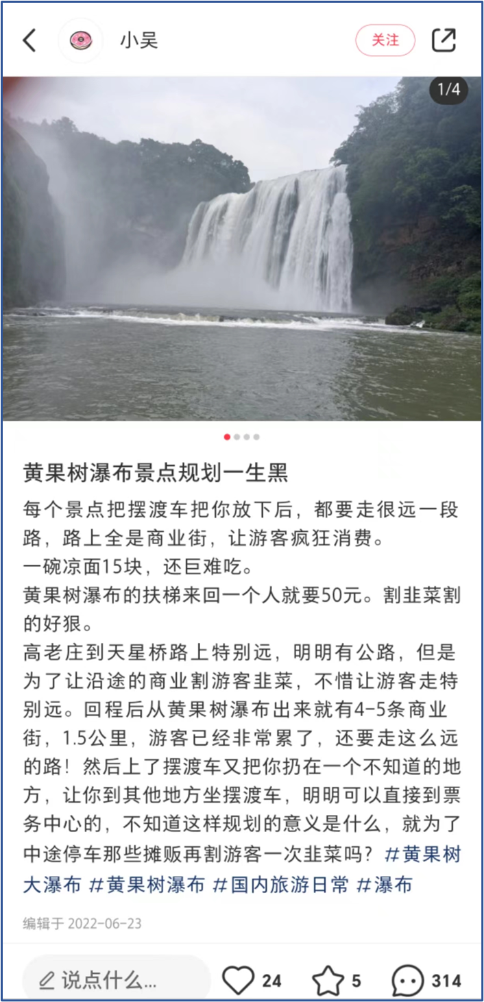 小红书网友对黄果树瀑布景区的吐槽。/小红书
