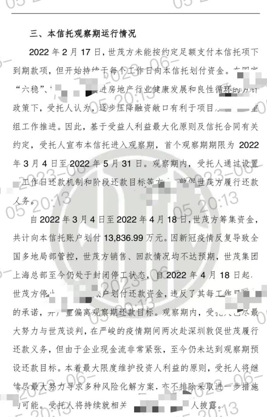 这一“观察期”方案很快失效了。中信信托对投资者披露称,“观察期”内世茂方合计向本信托账户划付1.38亿元,但自2022年4月18日起,世茂方停止向本信托账户划付还款资金,违反了其每工作日还款的承诺,并严重偏离观察期还款目标。