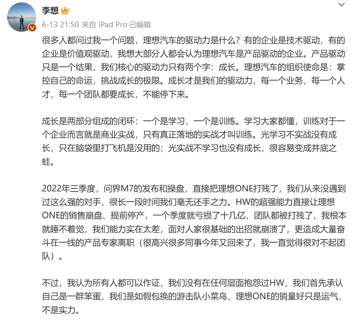 并且表示,在公司经营中学习了华为、比亚迪、BBA等公司的优势,最终在理想L8、理想L7Air车型上取得成功。李想总结道,“我们(理想汽车)核心的驱动力只有两个字:成长。”