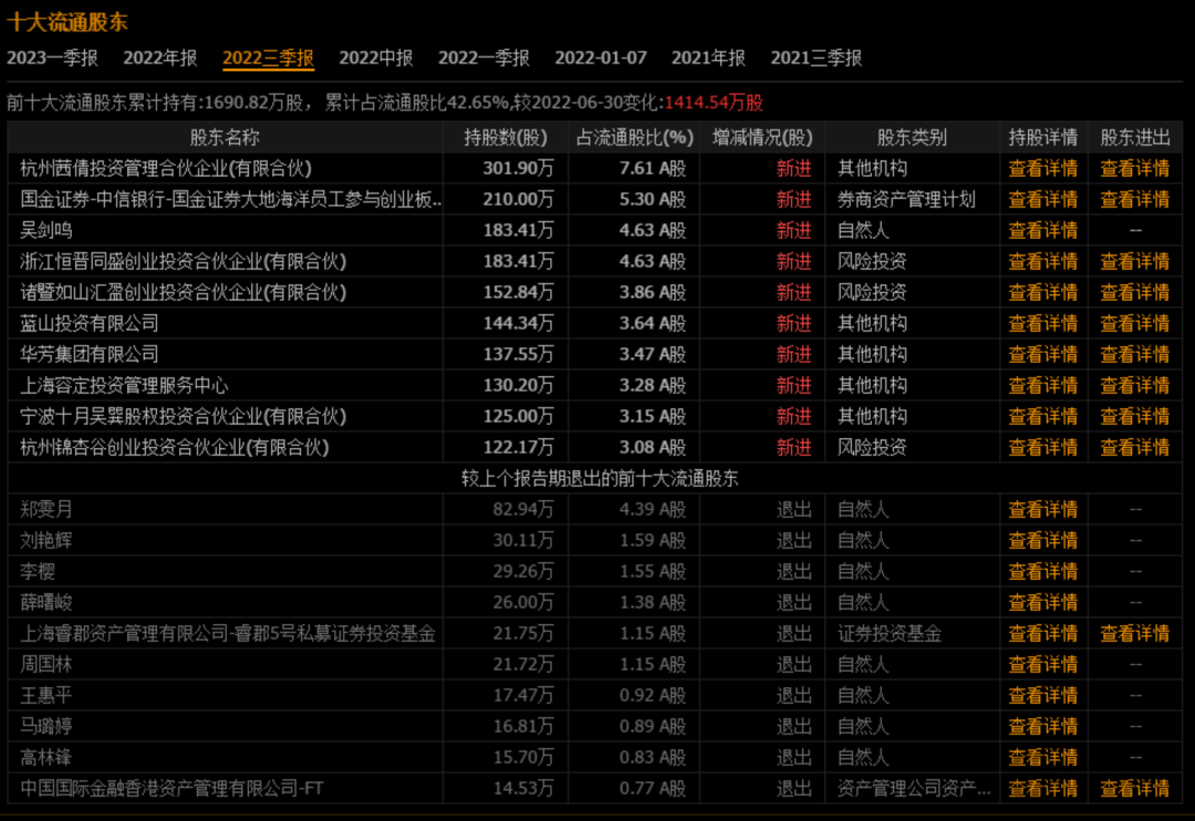 所以,公司虽然上市不到两年,但是公司的十大流通股东已经换了一批又一批。其中,最值得注意的就是公司股价开始上涨时的2022年三季度十大流通股东列表变化,目前看完完全全换了一遍。