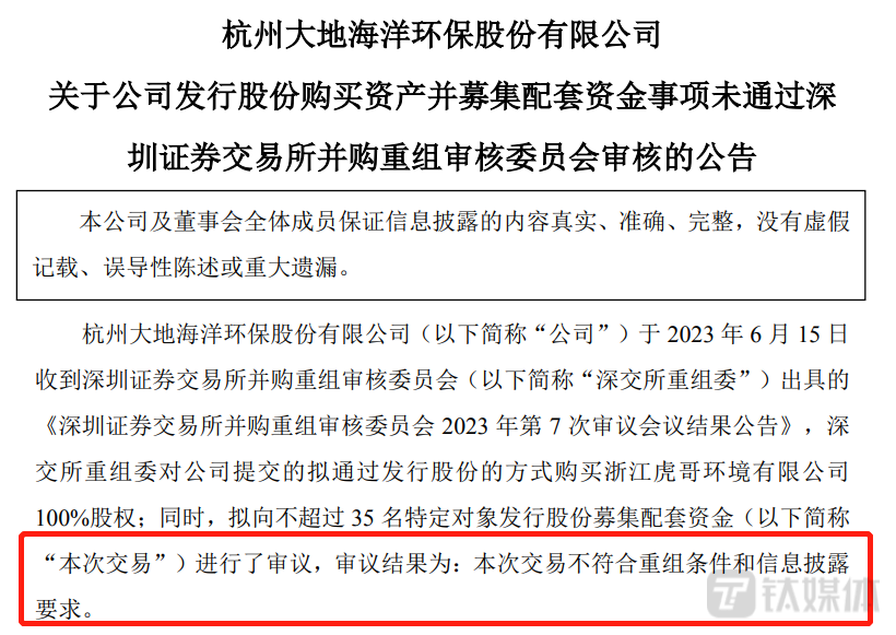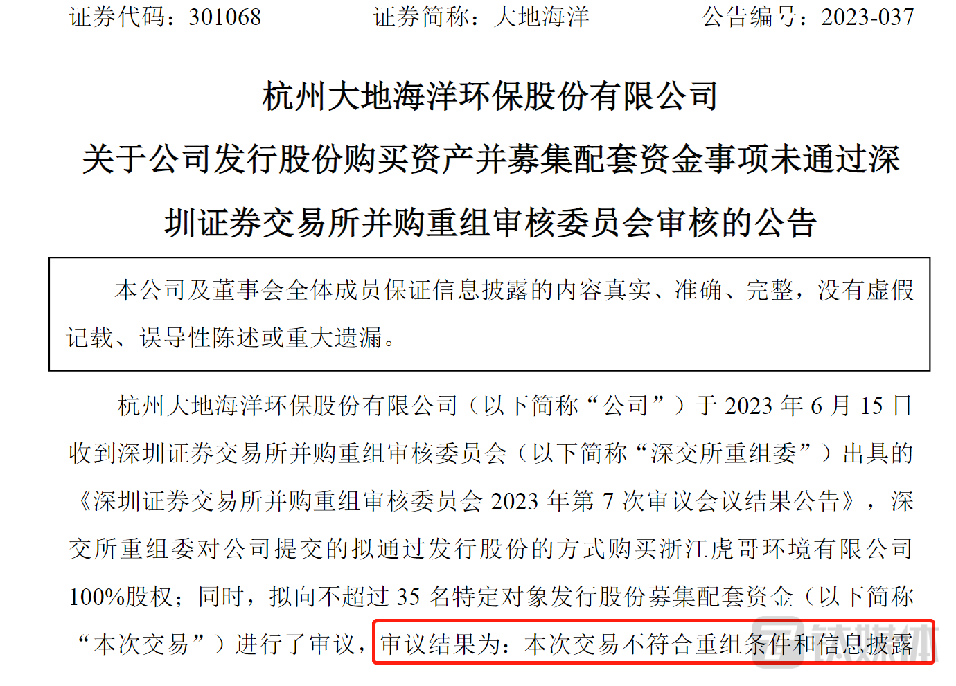 日前,大地海洋发布公告称,公司收购浙江虎哥环境有限公司(以下简称“虎哥环境”)100%股权事项被深交所否决。实际上,6月15日深交所就对公司发行股份购买资产并募集配套资金申请作出终止审核的决定。
