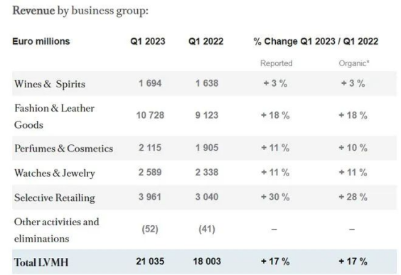 首先,LVMH集团用多业务线、多品牌矩阵来应对此消彼长的业务风险;目前,LVMH集团总共有五大业务板块,分别是时装皮具、香水和美妆、手表和珠宝、精品零售、酒类业务。2023年第一季度财报显示,虽然酒类业务只有3%的增长,但其他业务均实现了两位数增长,尤其是精品零售增长高达30%。