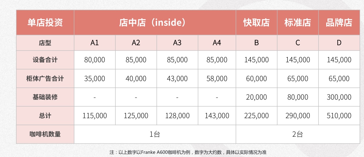 但相较瑞幸近50万元的投资预算,库迪的加入门槛看起来的确更低一些。店中店、快取店、标准店的投资预算分别为11.5-14.3万、22.5万元、29万元。其中,店中店更轻投资,只有1台咖啡设备,无基础装修费用。