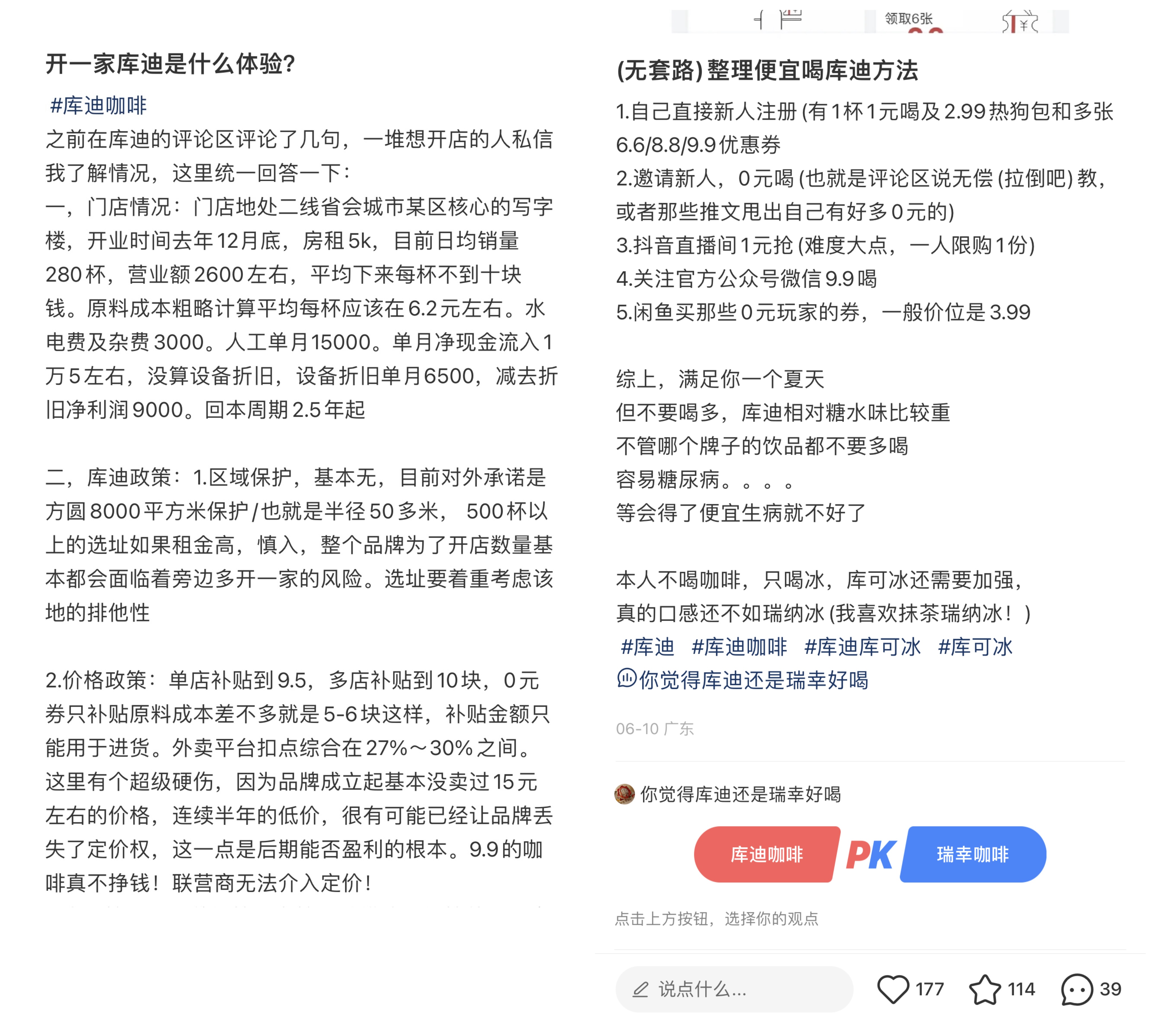 “单天500杯以上的选址如果租金高,慎入,贷款入局,更要慎入。库迪自成立到现在没卖过15元左右的价格,连续半年的低价很可能会影响后面盈利。9.9元/杯的咖啡真的不赚钱,联营商没法介入定价。”在小红书上,老明的言语中颇有“劝退”色彩。在他看来,瑞幸下场打价格营销,但房租、人工、供应链低于库迪,时间拉长答案会逐步清晰。