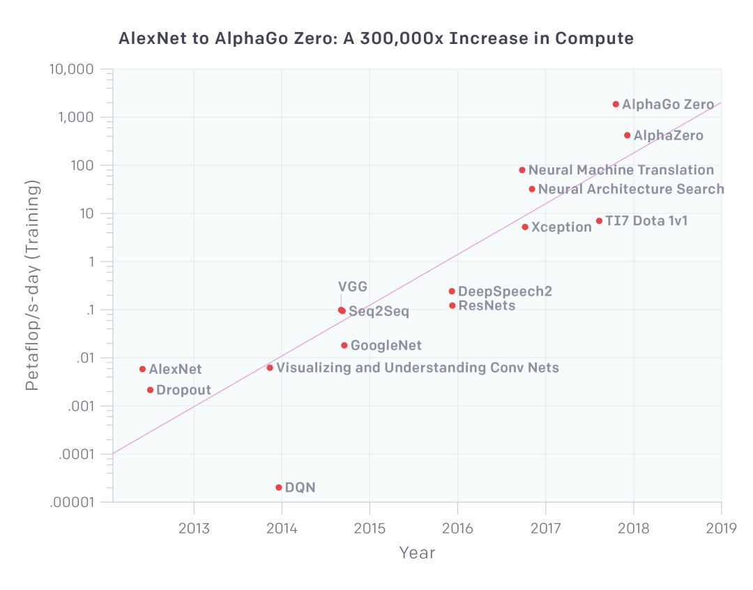 但这还不够,因为AI模型对算力的需求正在以月为单位指数级暴涨,OpenAI在2018年发布过一份报告:AI算力需求每个月翻番,这是被芯片行业奉为圭臬的摩尔定律花费18个月才能完成的事情。