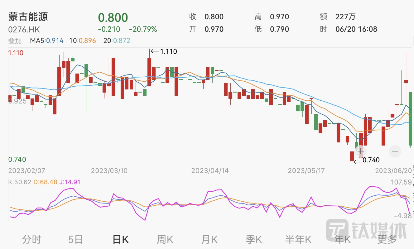 受业绩亏损影响,6月20日港股开盘后,蒙古能源股价便出现下滑走势,截至当天收盘,公司股价报收0.8港元,大跌20.79%,成交额为226.64万港元,当前公司总市值约1.51亿港元。(本文首发于钛媒体 APP,作者|陈伟纳)