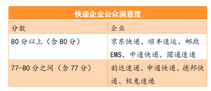 2022年三季度,国家邮政局公布的快递服务公众满意度排行榜上,极兔速递的得分处在77-80分之间,而京东、顺丰、邮政、中通、圆通的得分在80分以上,比极兔高了一档。