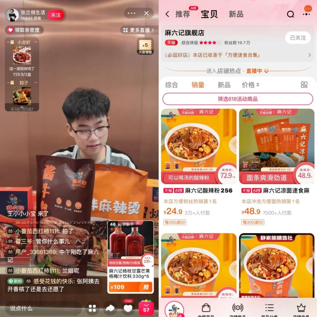 比如,抖音张兰俏生活店铺,素食酸辣粉累计销量超过276万,稳占第一、预制菜小龙虾销量2万、毛血旺25.8万,素食产品远比预制菜受欢迎。淘宝店铺也是如此,酸辣粉月销超4万、小龙虾毛血旺只有区区不超过500的月销量。