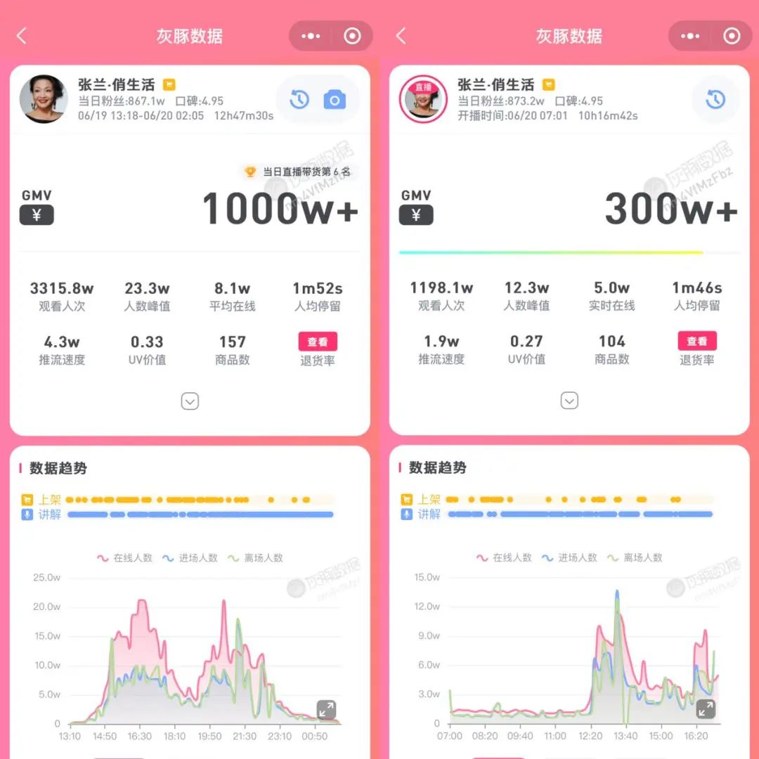 据灰豚数据显示,6月19日张兰在抖音开播,不到6小时,便吸引1700万观看人次,全天共吸引观看人次3300万,GMV达1000万。
