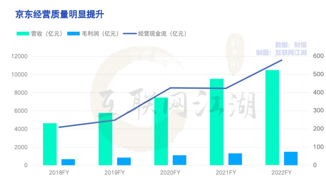 2019年到2022年,京东营业收入从5768亿增长到1万亿,毛利润从844亿增长到1470亿,公司经营现金流从247.81亿增长打破578亿,增长234%。