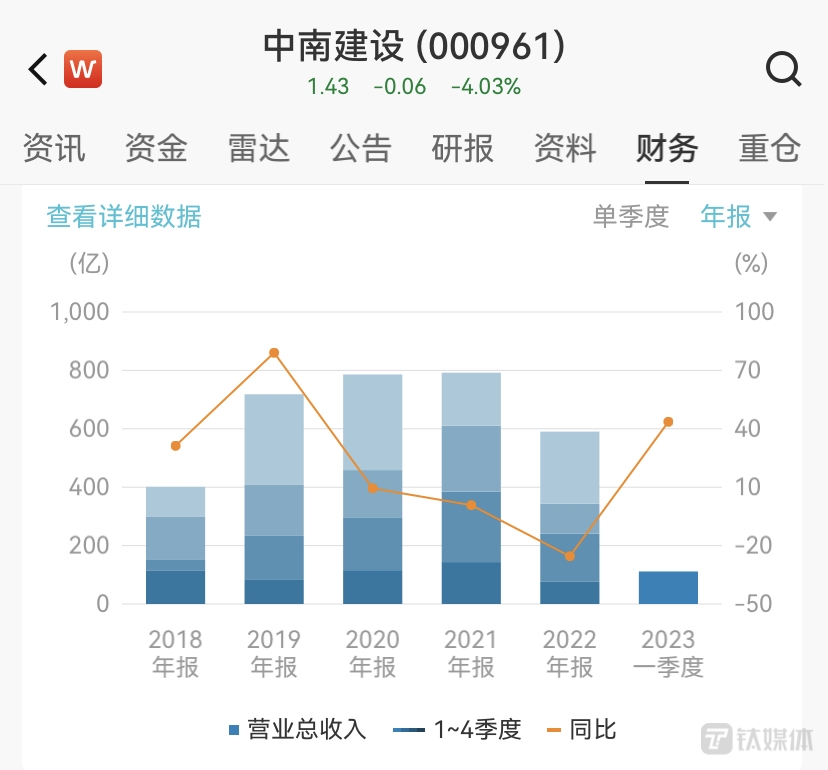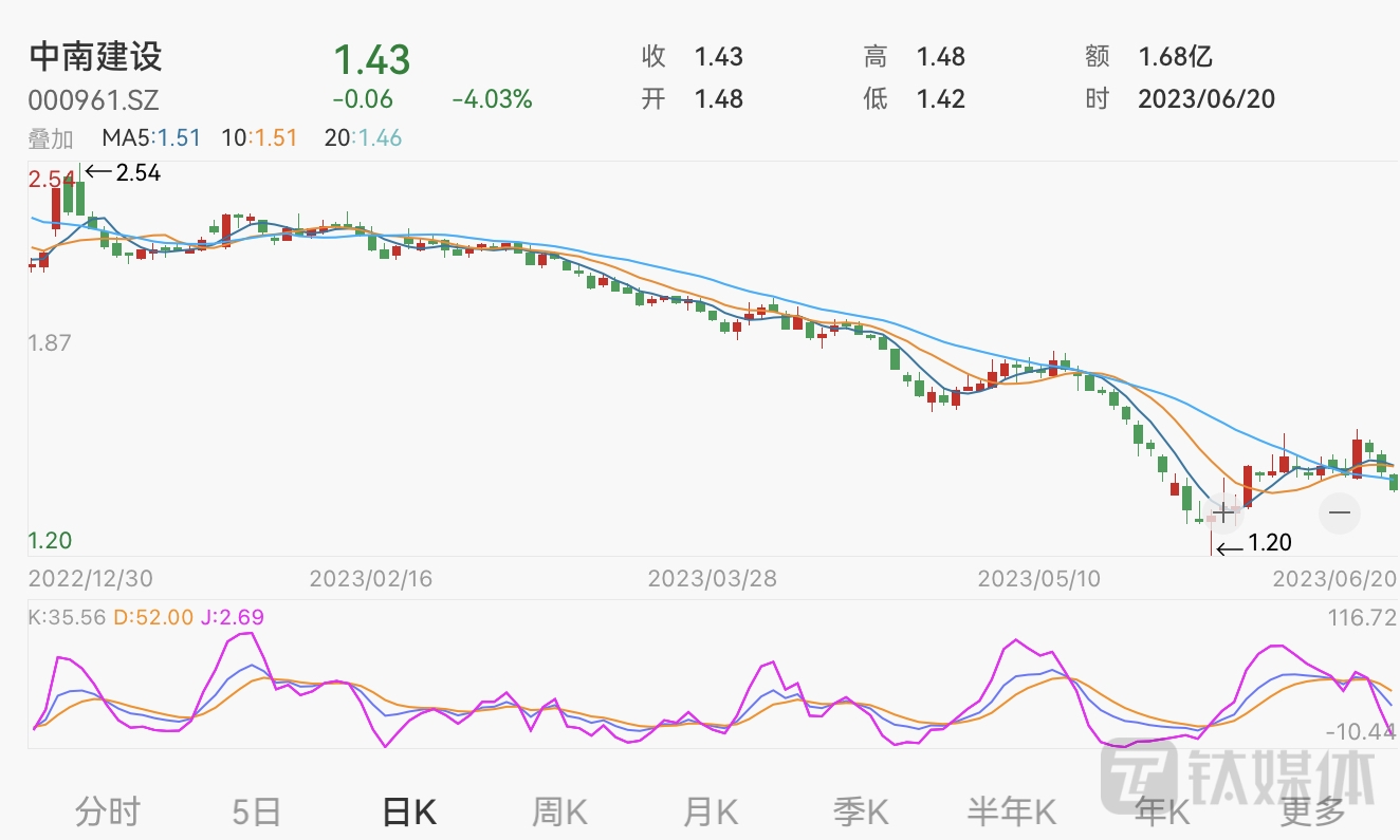 上述消息发出后,中南建设股价延续了前两个交易日(6月16日/19日)的下滑走势,持续下挫。截至6月20日股市收盘,公司股价报收1.43元,跌4.03%,成交额为1.68亿元,当前公司总市值约54.72亿元。