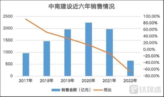 在政策日益紧缩、销售下行的环境中,中南建设开始暴露出销售增幅后力不足、三四线存货销售释放局限等问题。2021年,公司累计合同销售金额约1973.7亿元,首次实现负增长;2022年降幅更为明显,累计合同销售金额约649.2亿元,销售面积约543.2万平方米,同比减少67.1%、63%,为近6年最差表现。