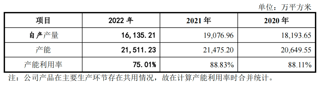 报告期内,新明珠的自产产量分别为1.82亿平方米、1.91亿平方米、1.61亿平方米;产能利用率(又称设备利用率,是工业总产出对生产设备的比率)分别为88.11%、88.83%和75.01%。
