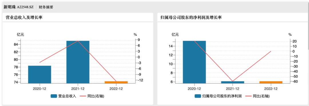招股书显示,2020年-2022年(以下简称“报告期”),新明珠的营业收入为78.35亿元、84.93亿元和74.24亿元,同比增长率分别为-2.83%、8.40%和-12.59%;同期归母净利润15.17亿元、6.11亿元和6.12亿元,同比增长率分别为20.77%、-59.75%和0.15%。