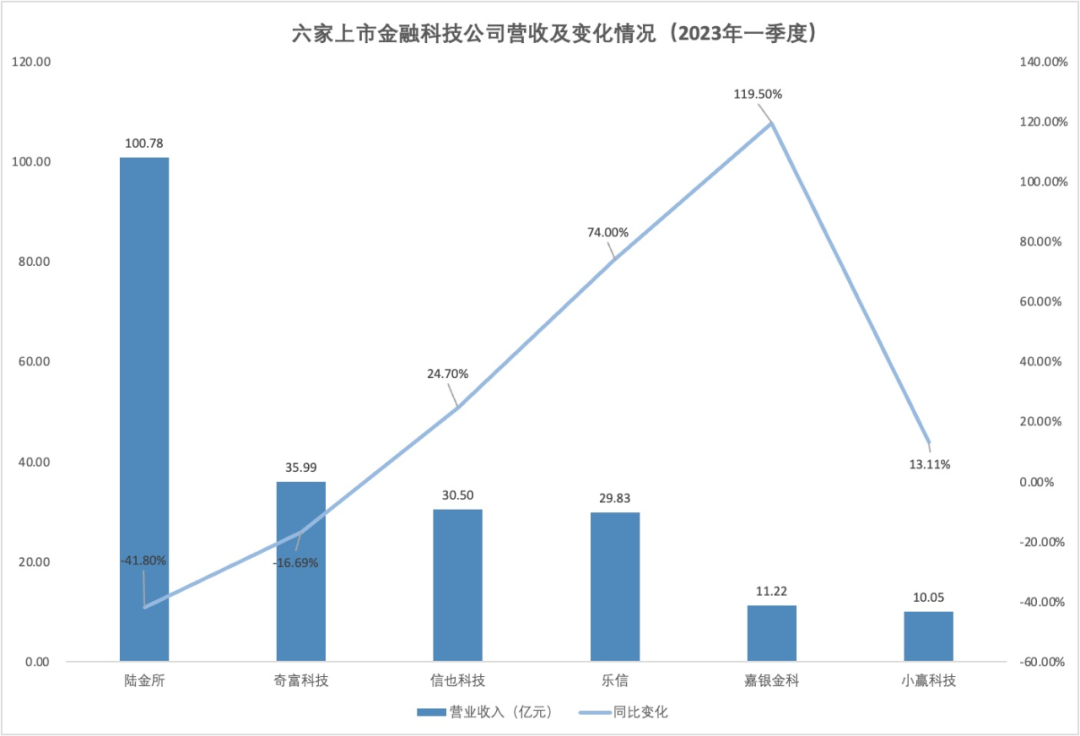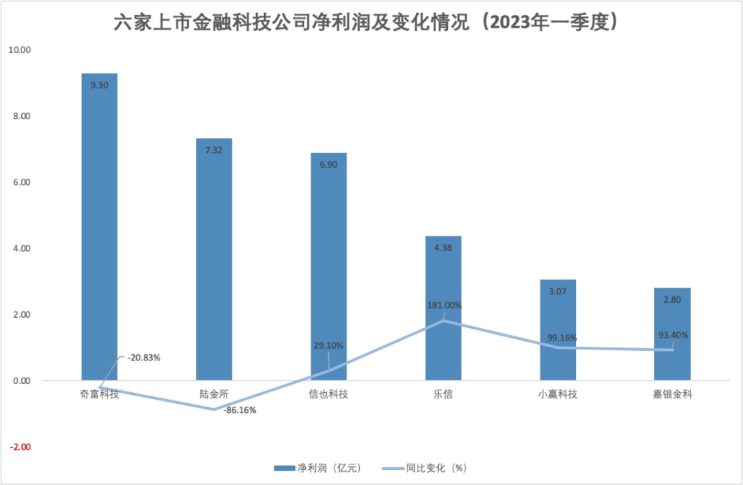 2023年一季度,金融科技公司的业绩呈现修复迹象。与2022年同期对比,不论是营收还是净利润,大部分金融科技公司均实现了同比增长。