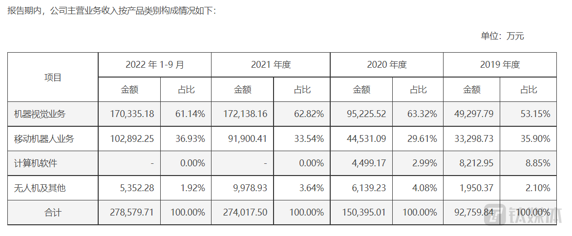 2019年-2021年以及2022年1-9月(下称“报告期”),海康机器主营业务收入来自于机器视觉业务、移动机器人业务、计算机软件和无人机及其他四类业务。其中,机器视觉业务和移动机器人业务合计占主营业务收入比例分别为 89.05%、92.93%、96.36%和98.07%,占主营业务收入的绝大部分且占比逐年提高。