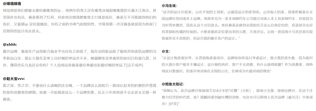 这次眷茶的品牌升级活动,由知名营销人小马宋的团队全盘操刀,从品牌新名字到形象定位,再到视觉设计均由小马宋团队负责。面对网络负面评价,有网友忍不住在某社交媒体公开留言小马宋有何看法,小马宋回复道:“我觉得挺好的,也许有人不喜欢。”