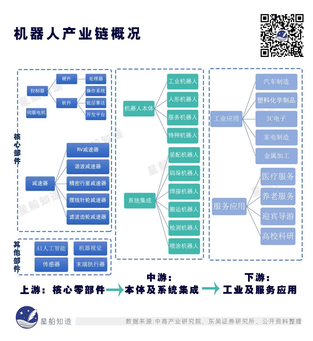 要解答这个反直觉现象,星船知造还得从人形机器人既传统硬核(工业机器人老三样)、又酷炫前沿(人工智能)的产业链角度进行分析——