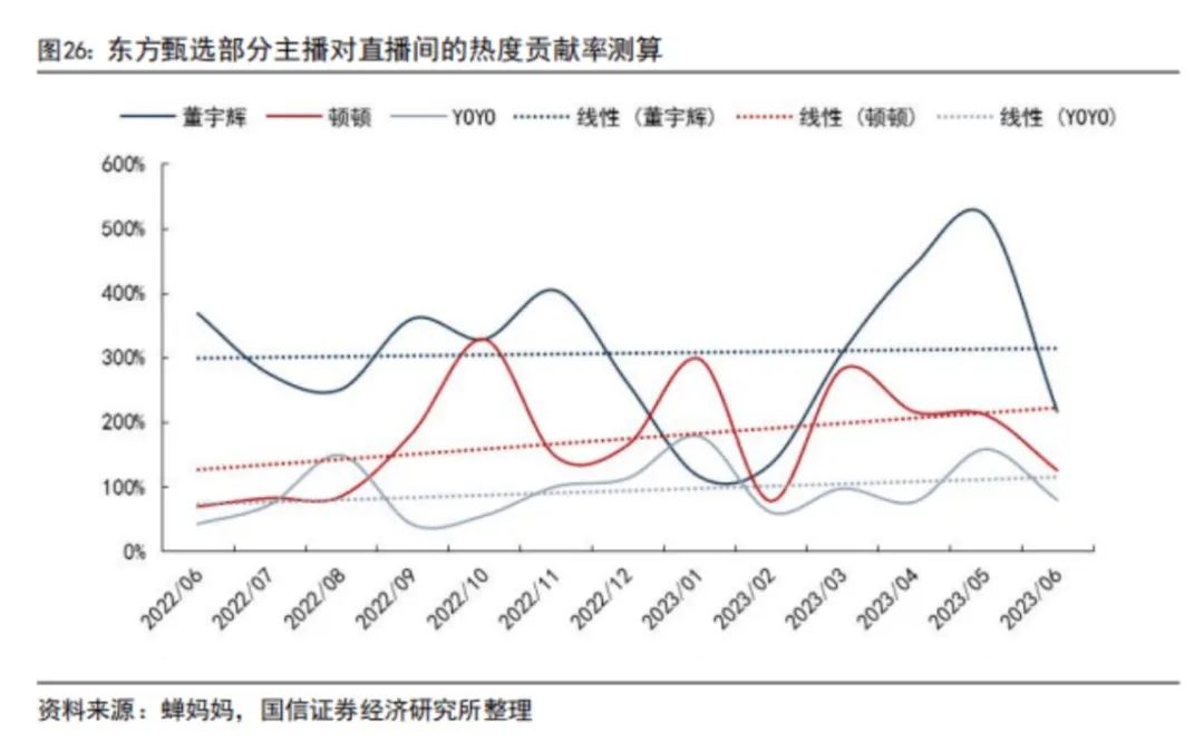 此外,诸多因素影响着东方甄选美丽生活的崛起。譬如主播的热度贡献值呈上升趋势,据国信证券分析指出,主播顿顿的热度贡献率,由2022年6月直播间爆火之初的40%-70%提升至今年6月份100%-200%的水平,热度贡献率仅次于董宇辉的300%。