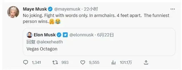 北京时间6月23日6点05分,梅耶又发推称:“事实上,我取消了这场比赛。我还没告诉他们。但我还是要说,角斗取消了,以防万一……”面对母亲的一片爱子之心,马斯克也只能无奈地在这条推文下回复了一个“笑哭”的表情符号。