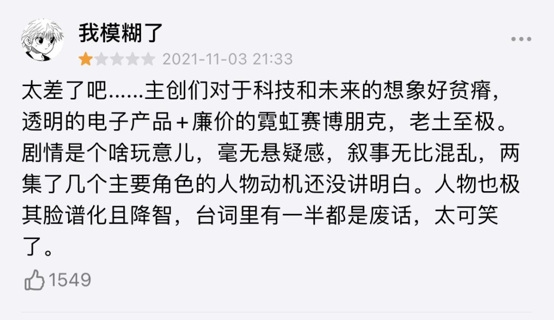 2021年爱奇艺迷雾剧场的《致命愿望》主打科幻+悬疑,豆瓣评分3.9,改编扑街砸了迷雾剧场的招牌。高赞评论直言:“主创们对于科技和未来的想象好贫瘠,透明的电子产品+廉价的霓虹赛博朋克,老土至极。剧情是个啥玩意儿,毫无悬念感,叙事无比混乱。”