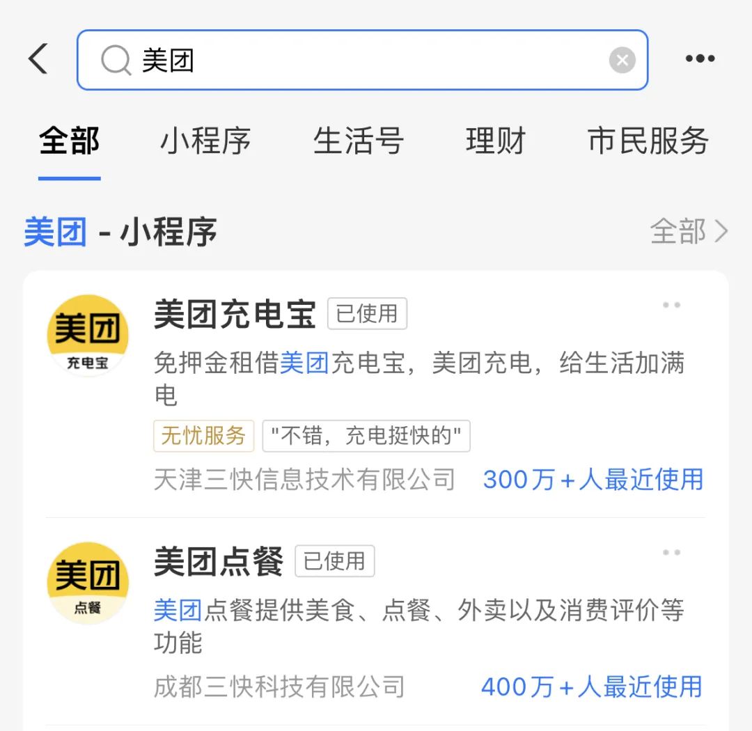 近日,有不少用户发现,在支付宝内搜索美团,已经可以直接通过小程序使用美团充电宝以及美团点餐,两大业务在支付宝上的最近使用频率,也已经达到了300万人次和400万人次。
