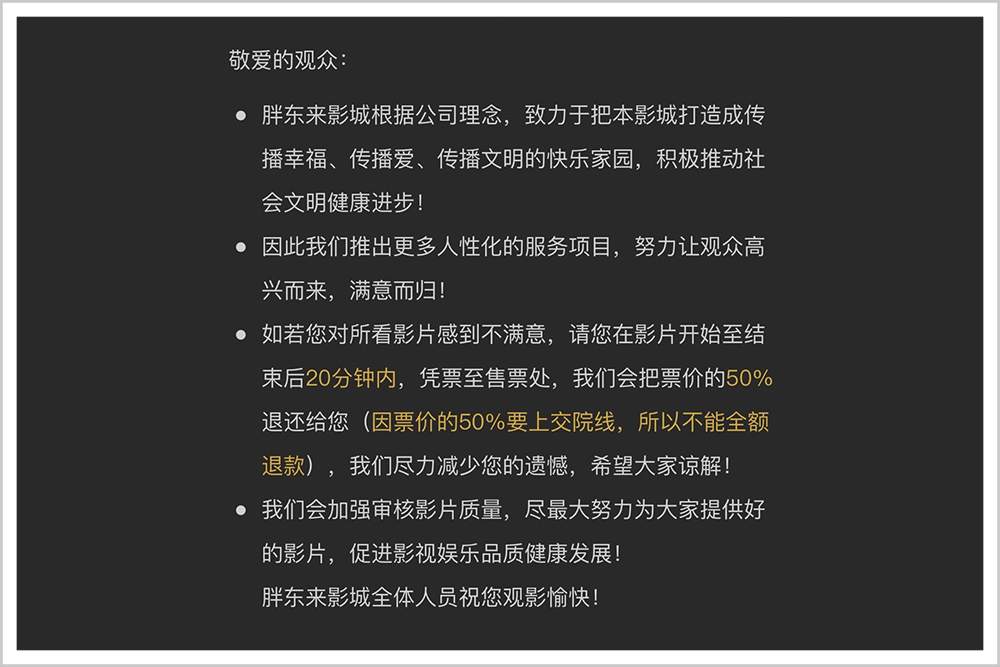 1998年,胖东来又先于电商10年推出退货服务。找胖东来退换货不需要小票,7日内退差价、15天内无理由。只要不满意,洗发水用了一半能退,果篮吃得只剩下一个也能退。就连电影不好看,都可以在结束后20分钟内半价退还。![]()