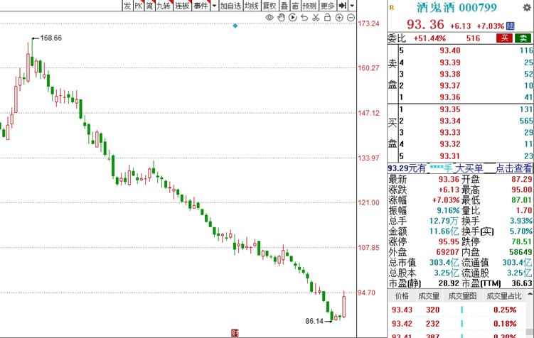 2022年第一季度,酒鬼酒(000799.SZ)业绩出现了向下的拐点;到今年一季报,其营收同比下降了42.87%,净利润也下降了42.38%。基本面的持续恶化也反映在了股价上,由此股价一路下跌。