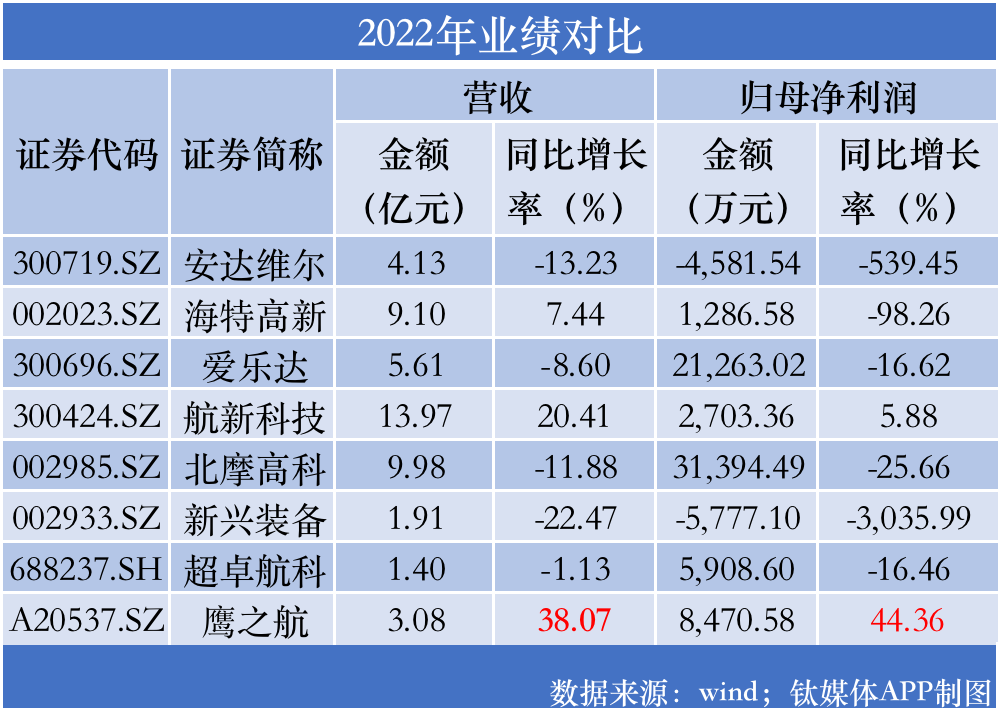 但钛媒体APP注意到,鹰之航去年业绩的突然爆发却与行业趋势背离。2022年,公司同行中仅有航新科技(300424.SZ)营收、净利润均增长,且其归母净利润同比仅增长5.88%,而安达维尔(300719.SZ)、爱乐达(300696.SZ)、北摩高科(002985.SZ)、新兴装备(002933.SZ)、超卓航科(688237.SH)、海特高新(002023.SZ)的业绩均出现下滑,新兴装备、安达维尔甚至出现亏损。