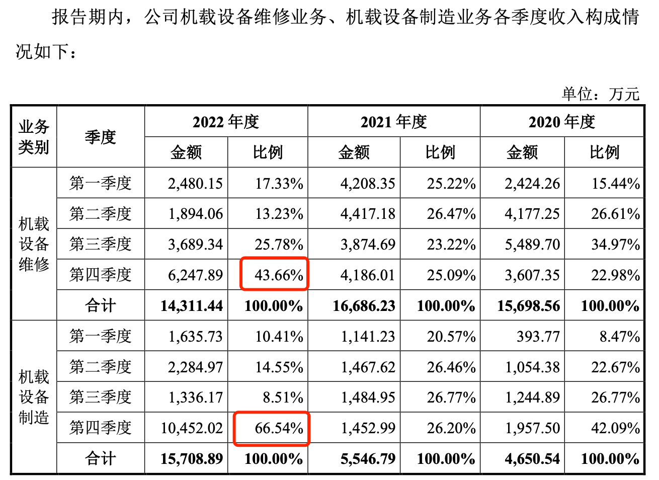 但2022年,公司第四季度机载设备维修业务贡献收入6247.89万元,占比43.66%;机载设备制造业务贡献收入1.05亿元,占比高达66.54%。有鉴于公司此前在接受现场检查时被查出存在跨期确认收入的问题,公司去年四季度的收入异常高增也再次遭到交易所的“盘问”。