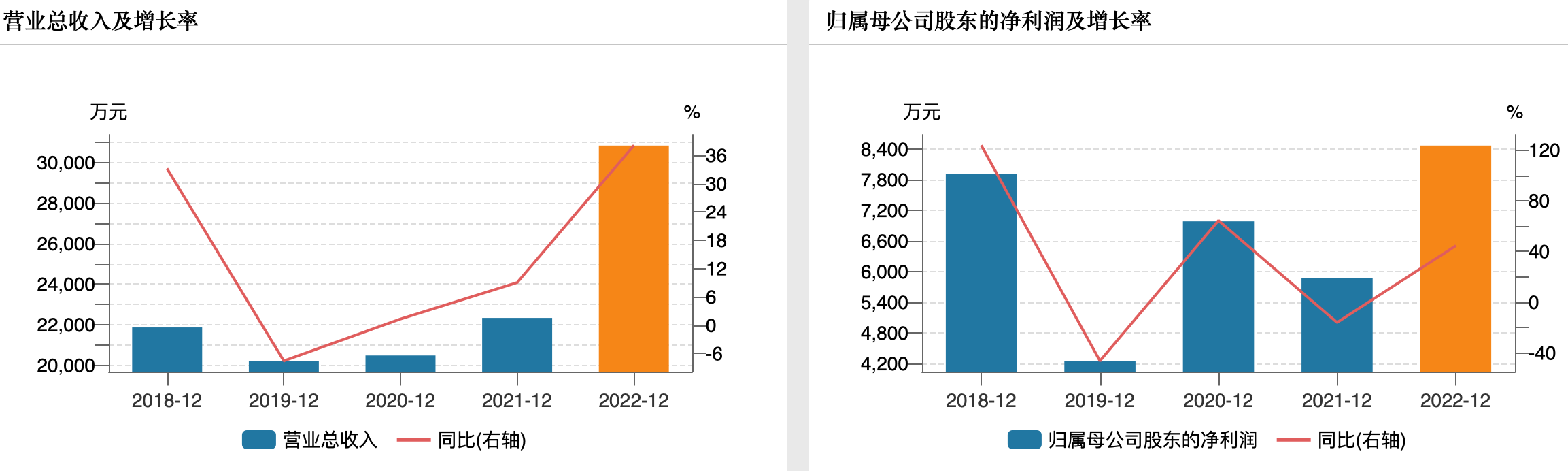 2018年-2021年,公司营收分别为2.19亿元、2.02亿元、2.05亿元、2.23亿元,同比增长33.15%、-7.55%、1.32%、9.04%;归母净利润7911.41万元、4251.61万元、6985.65万元、5867.65万元,同比增长123.45%、-46.26%、64.31%、-16%。