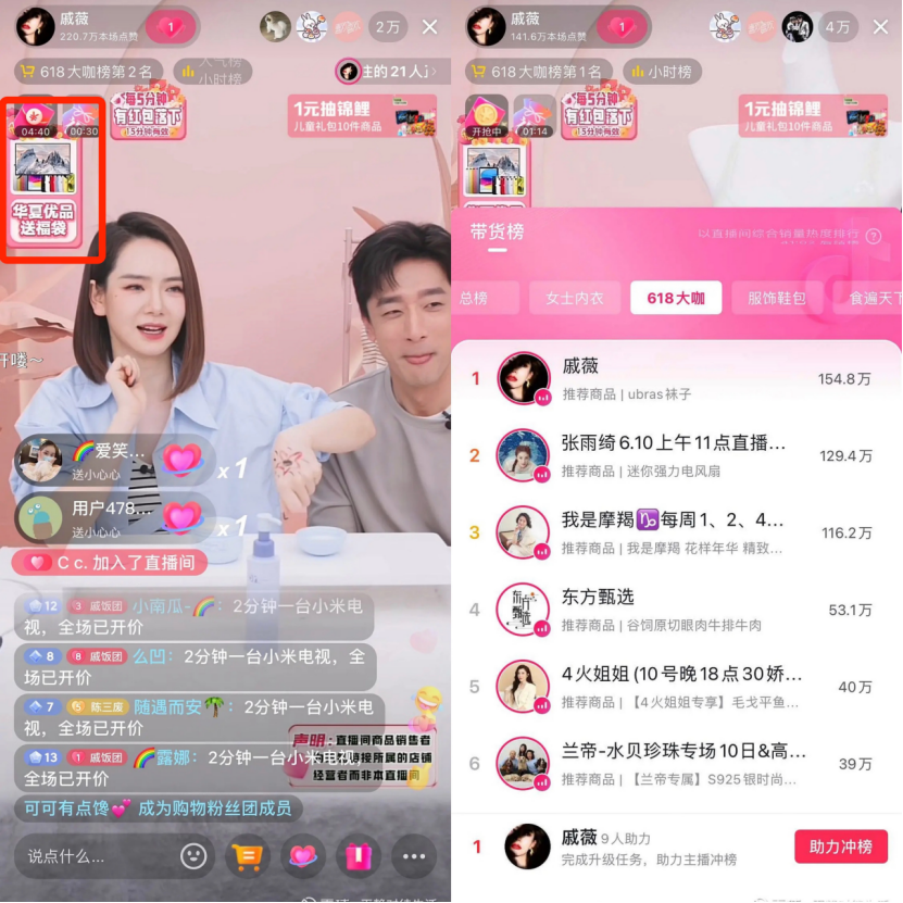 当时的戚薇是明星中少有的未陷入“首秀即巅峰”魔咒的明星。由于戚薇在多个影视剧以及综艺节目上充分展现出在美妆、恋爱观念和时尚等专业领域优势,把直播间长期定位在美妆垂类,并以美妆、时尚、生活为主要选品方向,每月固定2-3次直播,加上她先后签约薇娅背后的MCN谦寻和罗永浩背后的MCN交个朋友,有着强硬的选品供应链和最低价优势,成为公认的抖音美妆垂类头部主播。
